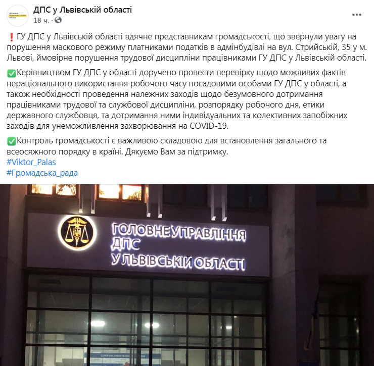 ГУ ДПС у Львівській області вдячне представникам громадськості, що звернули увагу на порушення маскового режиму платниками податків в адмінбудівлі на вул. Стрийській, 35 у м. Львові, ймовірне порушення трудової дисципліни працівниками ГУ ДПС у Львівській області.
