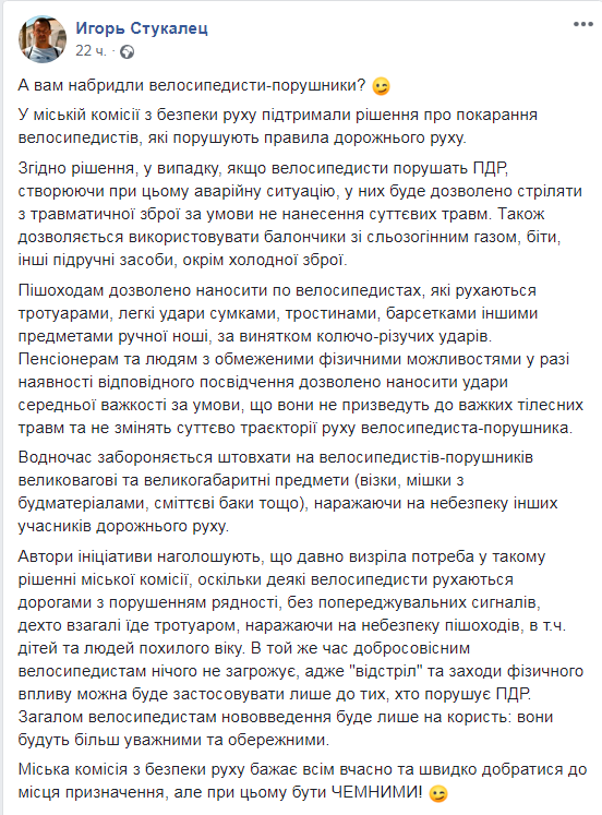 Як наголошує у своєму дописі Ігор Стукалець, “деякі велосипедисти рухаються дорогами з порушенням рядності, без попереджувальних сигналів, дехто взагалі їде тротуаром, наражаючи на небезпеку пішоходів, в т.ч. дітей та людей похилого віку”.