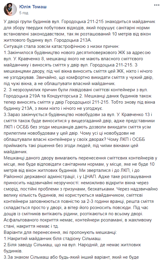 “Мешканці даного двору вимагають перенесення сміттєвих контейнерів у місце, яке буде відповідати санітарним нормам, у місце, яке не буде 10 метрів від вікон житлових будинків. Ми зверталися і до ЛКП, і до Районної державної адміністрації, і у ЦНАП. Адже таке розташування приносить надзвичайні незручності: неможливо відкрити вікна через сморід, постійні проблеми з гризунами, безхатьками. Через надзвичайно велику кількість будинків, які користуються майданчиком, сміттєві контейнери заповнюються повністю за 2-3 години вранці, решта сміття складається просто у дворі, а вітер його розносить повсюди. Під час дощів із смітників витікають рідини, розтікаються по всьому дворі. Асфальтованого покриття немає, контейнери розламані, в жахливому стані, накриття немає“, – наголошується у зверненні.