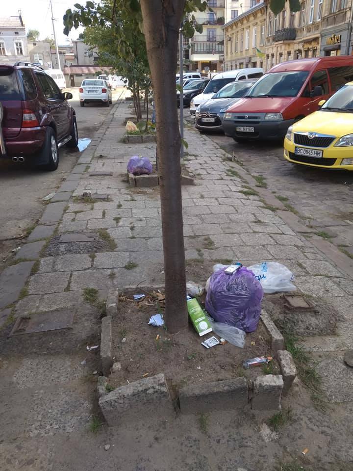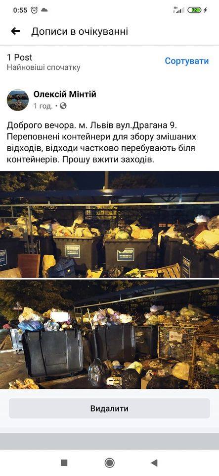 “Львів знову потопає в смітті. Мер Садовий геть самонемічний? Проспект Червоної калини, 39, 49, сміття не вивозять біля тижня часу і періодично ситуація повторюється, поряд дитячий майданчик! Аналогічно:вулиця Скрипника 7, пл. Липнева, вул. Дунайська 7, Стрийський парк, – кінотеатр Львів, вул. Лемківська 15…”, – написав на своїй сторінці у ФБ Zinoviy Huzar.