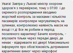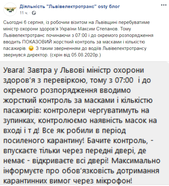 Як зазначається, “з таким зверненням до водіїв Львівелектротрансу звернувся директор. (скрін від 05.08.2020р.)”.