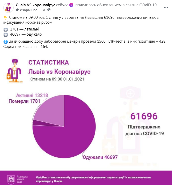 У Львівській області, станом на 09.00 год 1 січня, 61696 підтверджених випадків інфікування коронавірусом, 1781 — летальні, 46697 — одужало.