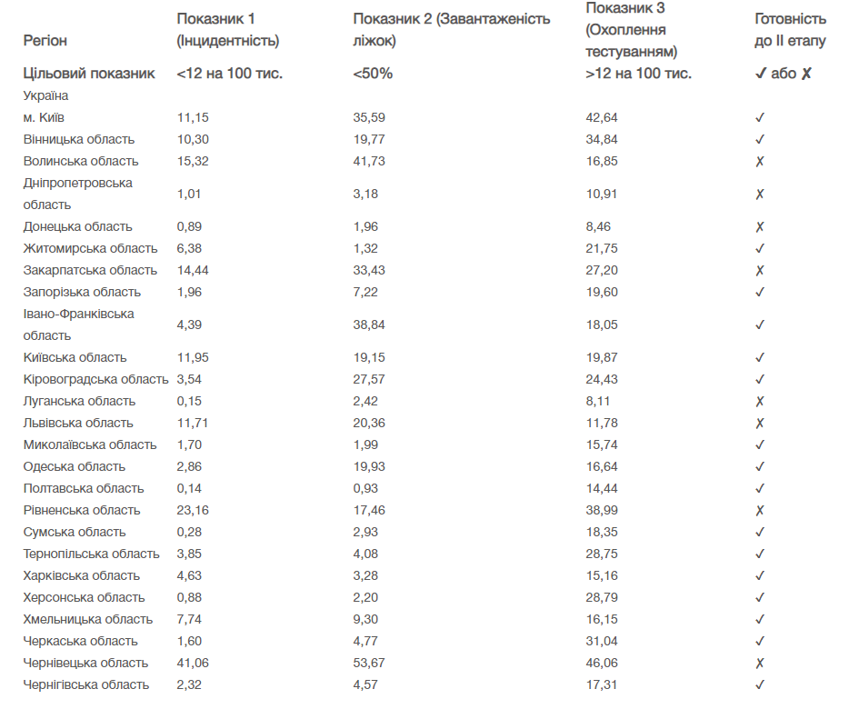 Відповідно до показників епідемічної ситуації в регіонах, а саме – інцидентності, завантаженості ліжок у закладах охорони здоров’я з хворими на COVID-19 та кількості тестувань на коронавірус, до другого етапу послаблення карантину залишаються неготовими Волинська, Дніпропетровська, Донецька, Закарпатська, Луганська, Львівська, Рівненська та Чернівецька області.