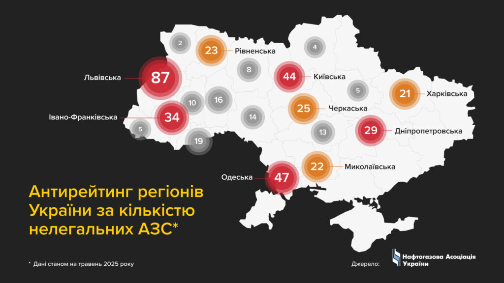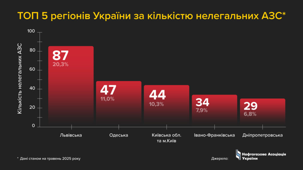 | Область | Кількість нелегальних АЗС* (травень 2025 ) |