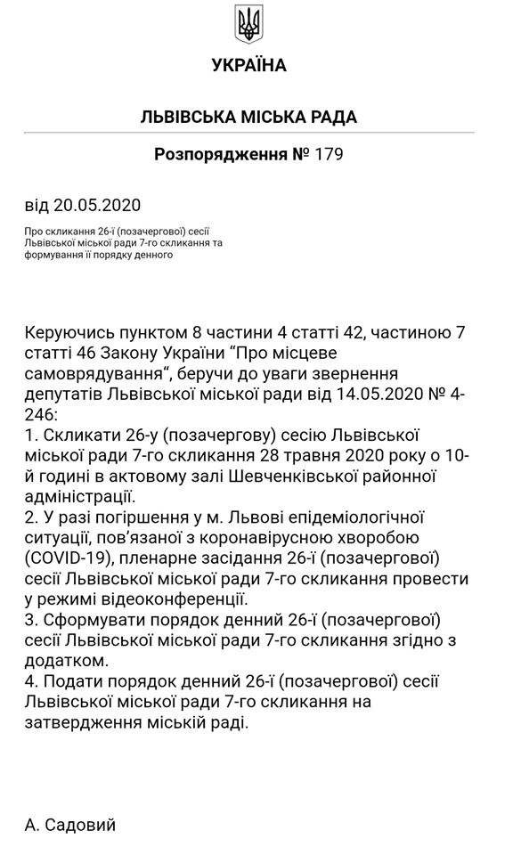 “На вимогу депутатів Львівської міської ради, Андрій Садовий скликає позачергову сесію”, – йдеться у дописі.