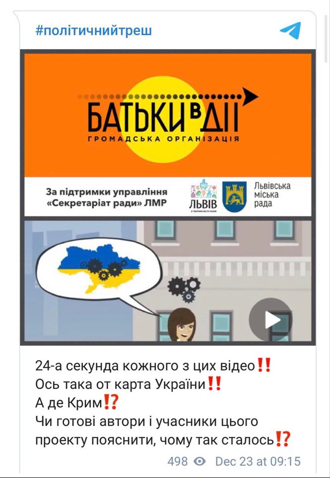 На одному з офіційних YouTube-каналів Львівської міськради опублікували чотири відео з картою України без Криму. Ролики виготовила громадська організація “Батьки в дії” як невеликий курс для старшокласників про роботу мерії, депутатів та чиновників у Львові.