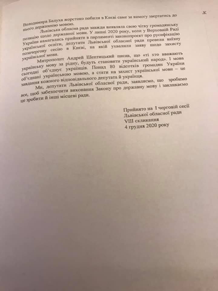 Вона також інформує, що «сьогодні Львівська обласна рада, за ініціативи Європейської Солідарності, прийняла заяву до прем‘єр-міністра, президента про забезпечення виконання закону «Про забезпечення функціонування української мови як державної».