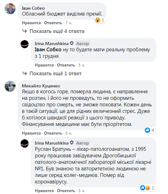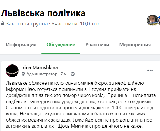 «Львівське обласне патологоанатомічне бюро, за неофіційною інформацією, готується припинити з 1 грудня приймати на дослідження тіла тих, хто помер через ковід. Причина – невиплата надбавок, затверджених урядом для тих, хто працює з ковідними. Станом на сьогодні вони провели дослідження 1000 померлих від ковід. Не краща ситуація з виплатами в багатьох інших міських і обласних медичних закладах. І вже йдеться не про доплати, а про затримки в зарплатах. Щось Микичак про це нічого не каже»,- повідомляє Ірина Марушкіна на сторінці спільноти «Львівська політика» у ФБ.
