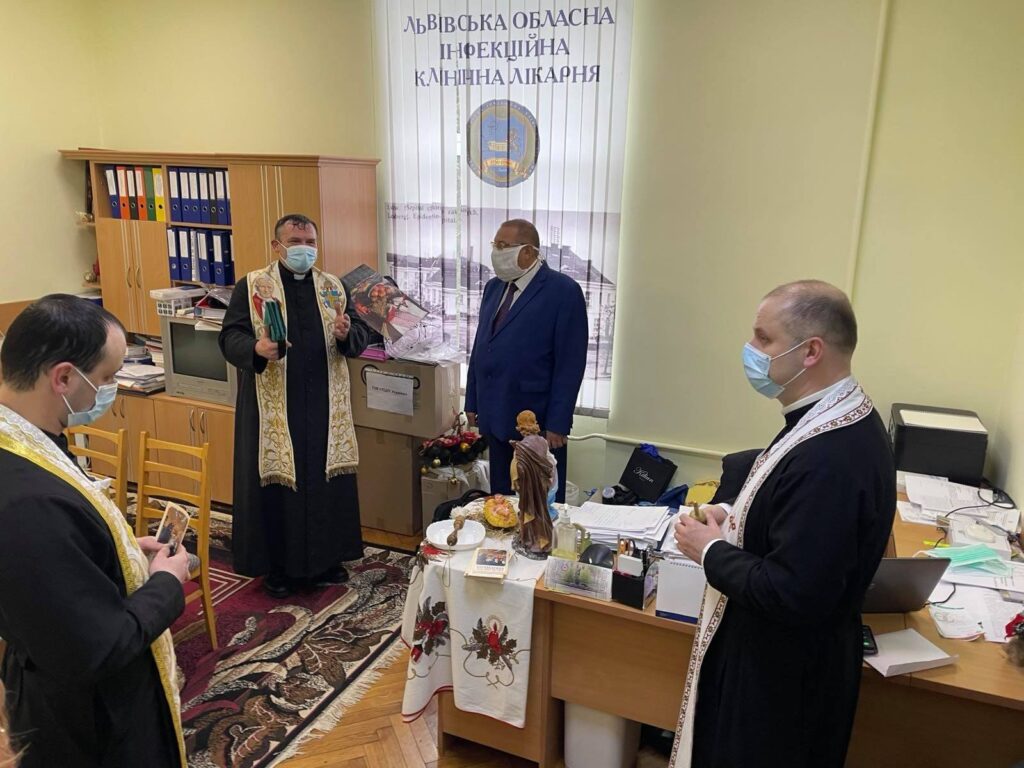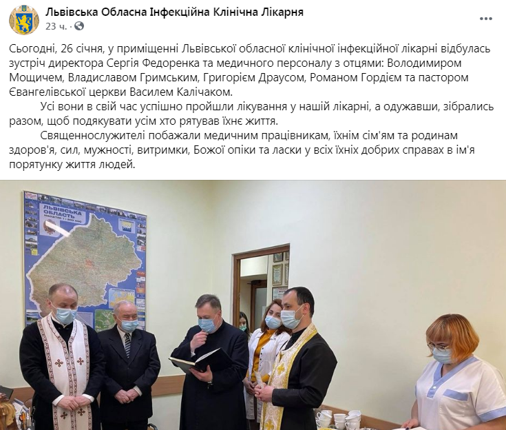 26 січня у приміщенні Львівської обласної клінічної інфекційної лікарні відбулась зустріч директора Сергія Федоренка та медичного персоналу з отцями: Володимиром Мощичем, Владиславом Гримським, Григорієм Драусом, Романом Гордієм та пастором Євангелівської церкви Василем Калічаком.