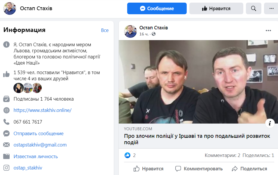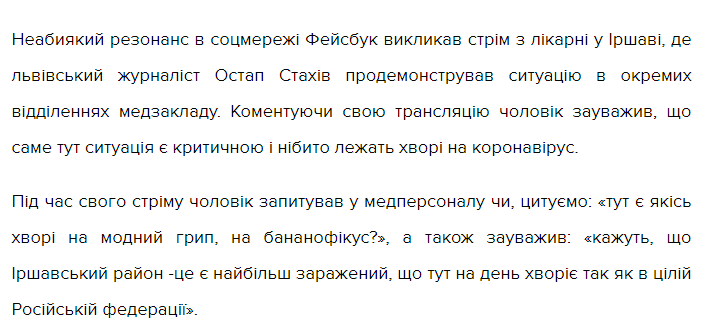 Як пише «Четверта студія» з посиланням на «Голос Карпат», неабиякий резонанс в соцмережі Фейсбук викликав стрім з лікарні у Іршаві, де львівський “журналіст” Остап Стахів продемонстрував ситуацію в окремих відділеннях медзакладу. Коментуючи свою трансляцію чоловік зауважив, що саме тут ситуація є критичною і нібито лежать хворі на коронавірус.