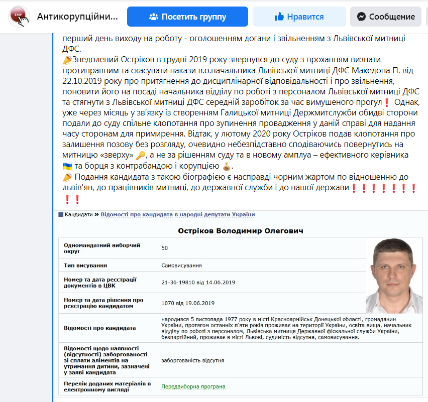 З відкритих джерел знаємо, що дисциплінарна комісія під керівництвом Острікова, звичайно не задарма, звільняла від відповідальності митників затриманих на корупції, що швидко помітила прокуратура і ініціювала службове розслідування щодо діяльності самого Острікова, який в цей час бере відпустку і балотується до Верховної Ради по 50 округу Донецької області як самовисуванець. У 50 окрузі він був технічним кандидатом, якого реально виставила на вибори партія ОПЗЖ. Відомо, що під час своєї «кандидатської відпустки» Остріков та його «довірені особи» добровільно-примусово збирали гроші з всіх змін у Львівській митниці, які працювали на кордоні на «виборчу кампанію».