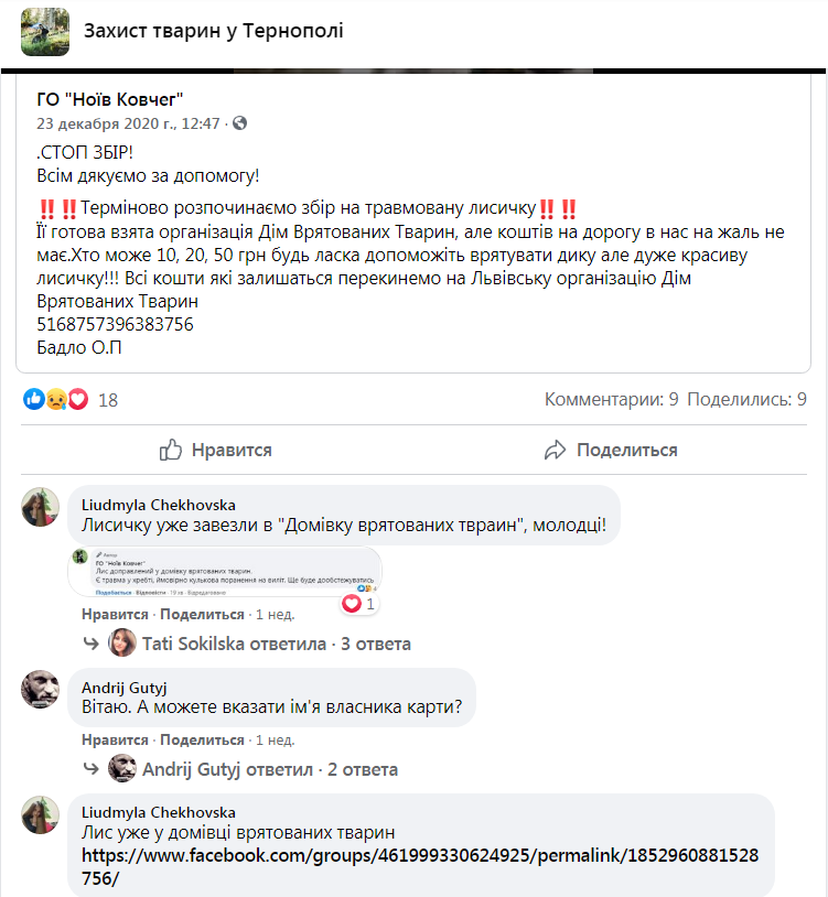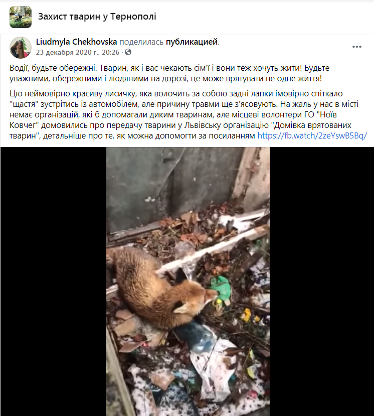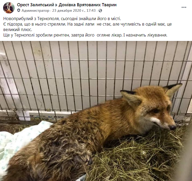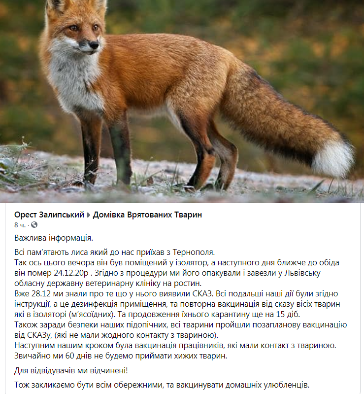 «Важлива інформація. Всі пам’ятають лиса який до нас приїхав з Тернополя. Так ось цього вечора він був поміщений у ізолятор, а наступного дня ближче до обіда він помер 24.12.20р . Згідно з процедури ми його опакували і завезли у Львівську обласну державну ветеринарну клініку на ростин.