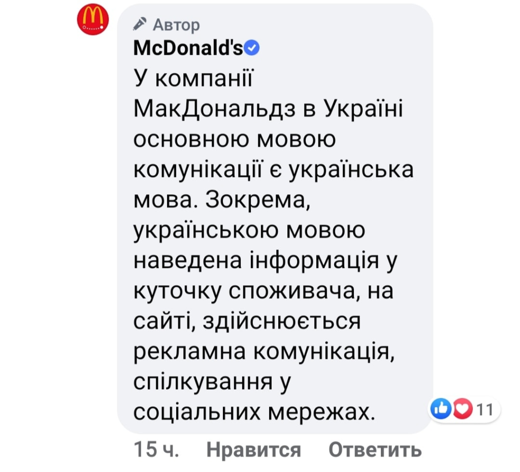 Зазначимо, що представники компанії вже прокоментували обурення клієнтів відсутністю російської мови: «У компанії МакДональдс в Україні основною мовою комунікації є українська мова. Зокрема, українською мовою наведена інформація в куточку споживача, на сайті, здійснюються рекламна комунікація, спілкування в соціальних мережах».