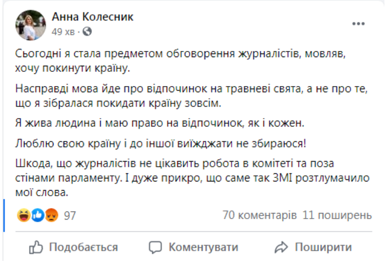 “Сьогодні я стала предметом обговорення журналістів, мовляв, хочу покинути країну. Насправді мова йде про відпочинок на травневі свята, а не про те, що я зібралася покидати країну зовсім. Я жива людина і маю право на відпочинок, як і кожен. Люблю свою країну і до іншої виїжджати не збираюся! Шкода, що журналістів не цікавить робота в комітеті та поза стінами парламенту. І дуже прикро, що саме так ЗМІ розтлумачило мої слова”, – написала Анна Колісник, проте згодом видалила свій допис.