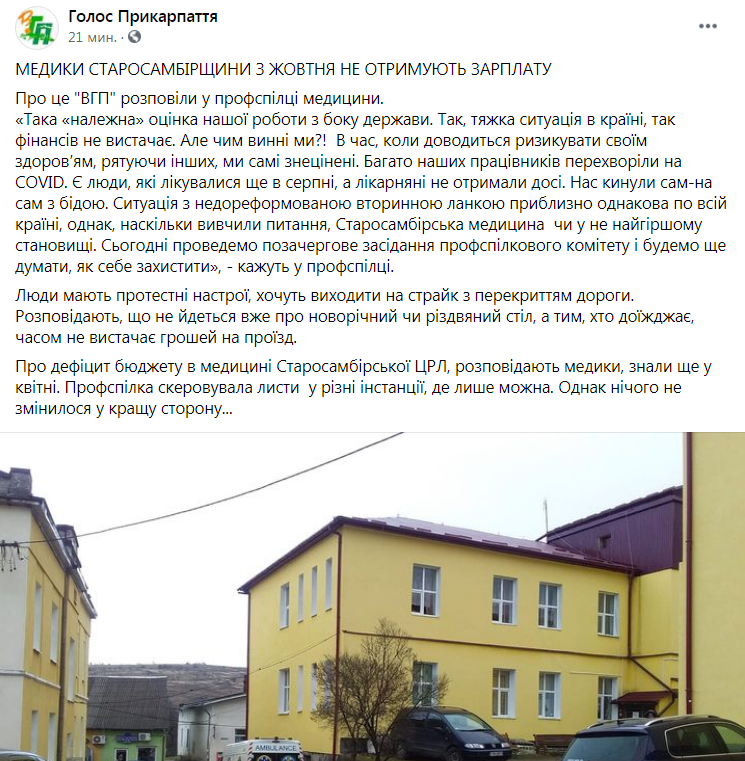 «Така «належна» оцінка нашої роботи з боку держави. Так, тяжка ситуація в країні, так фінансів не вистачає. Але чим винні ми?! В час, коли доводиться ризикувати своїм здоров’ям, рятуючи інших, ми самі знецінені. Багато наших працівників перехворіли на COVID. Є люди, які лікувалися ще в серпні, а лікарняні не отримали досі. Нас кинули сам-на сам з бідою. Ситуація з недореформованою вторинною ланкою приблизно однакова по всій країні, однак, наскільки вивчили питання, Старосамбірська медицина чи у не найгіршому становищі. Сьогодні проведемо позачергове засідання профспілкового комітету і будемо ще думати, як себе захистити», – кажуть у профспілці.
