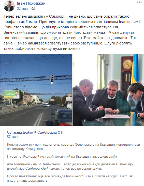 У коментарі до допису Іван Походжай зазначив, що “тепер і у Самборі. І не дивно, що саме обрали такого профана як Гамар. Пригадуєте історію з зеленим гвалтівником Іванісовим? Коли стало відомо, що він приховав судимість за зґвалтування, Зеленський заявив, що змусить здати його здати мандат. А сам депутат гвалтівник сказав, що доведе, що не винен. Вже майже рік доводить. Так само і Гамар намагався зґвалтувати свою заступницю. Слуги люблять таких, добирають команду дуже виточено”.