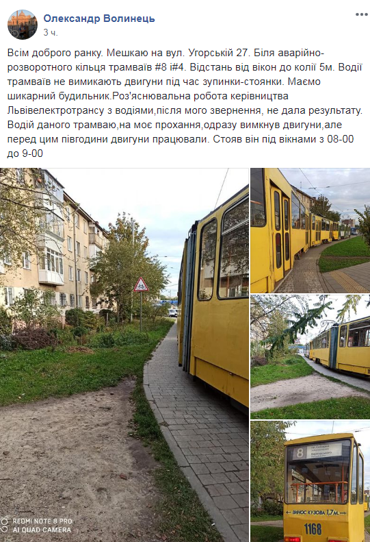 “Мешканець вулиці Угорської, що в Сихівському районі, в соцмережі Фейсбук поділився своєю історією щодо ранкових трамваїв та поведінки водіїв. Чоловік розповів, що живе у будинку №27, який знаходиться в кількох метрах від аварійно-розворотного кільця для сихівських трамваїв #8 та #4. Львів’янин скаржиться на водіїв трамваїв, які під час стоянок не вимикають двигуни.