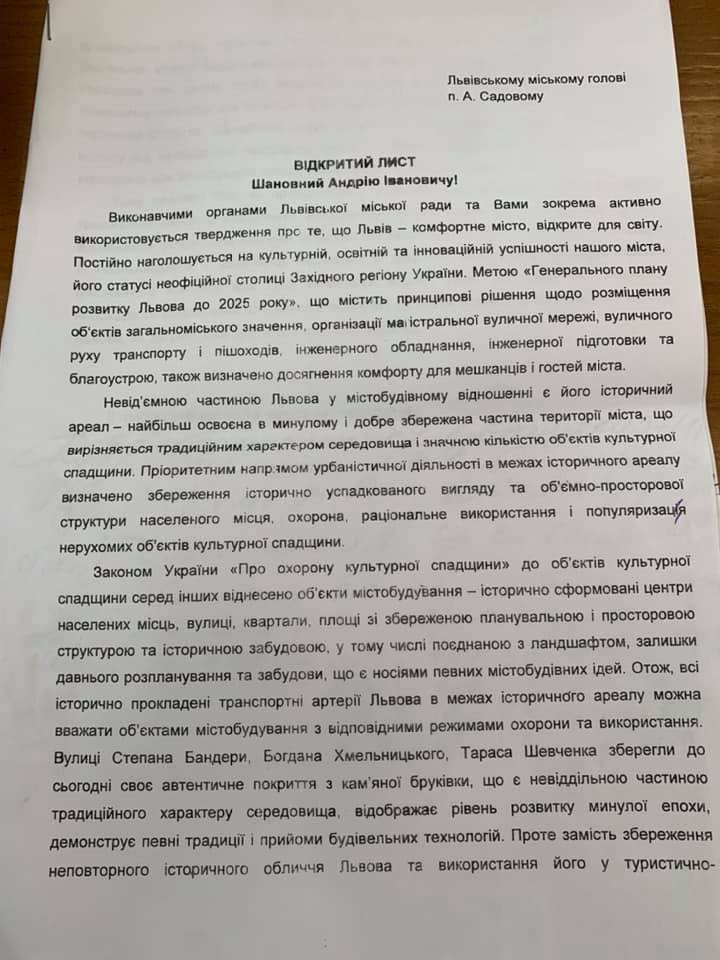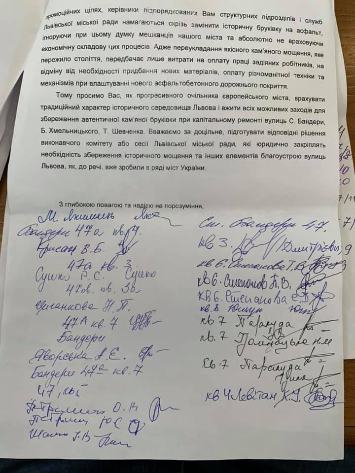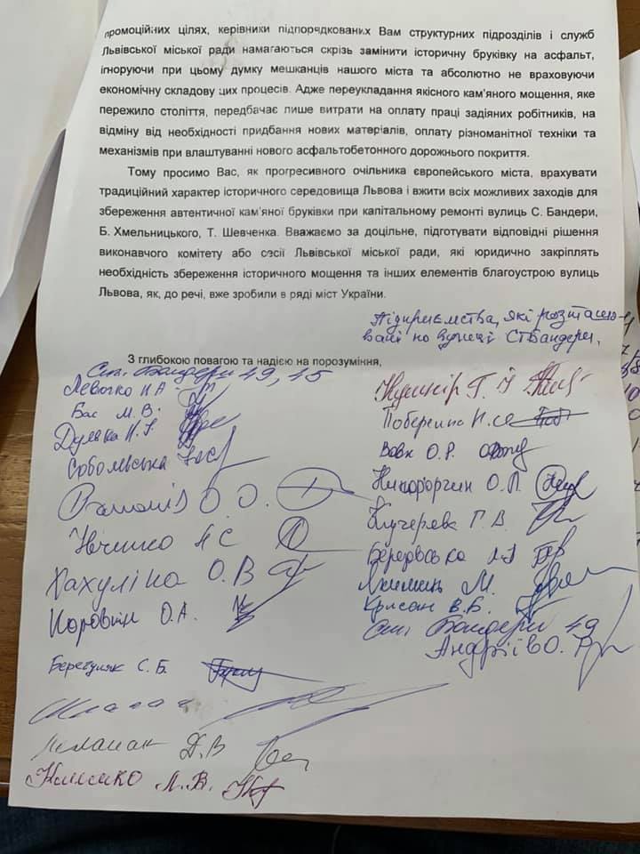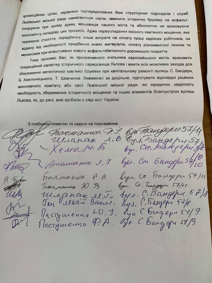 Таким чином, всі історично прокладені вулички Львова в межах історичного ареалу можна вважати об’єктами містобудування, які потрібно відповідно охороняти. Вулиці Степана Бандери, Богдана Хмельницького, Тараса Шевченка зберегли своє автентичне покриття з кам’яної бруківки, однак замість того, щоб використовувати його у туристично-промоційних цілях, міська влада намагається скрізь замінити історичну бруківку на асфальт, повністю ігноруючи думку мешканців”, – йдеться у дописі.