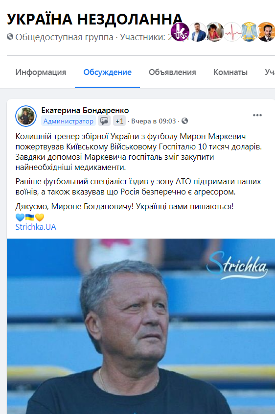«Раніше футбольний спеціаліст їздив у зону АТО підтримати наших воїнів, а також вказував що Росія безперечно є агресором. Дякуємо, Мироне Богдановичу! Українці вами пишаються!»,- зазначається у дописі.