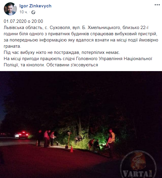 “1 липня о 20:00, с. Суховоля, вул. Б. Хмельницького, близько 22-ї години біля одного з приватних будинків спрацював вибуховий пристрій, за попередньою інформацією яку вдалося взнати на місці події ймовірно граната. Під час вибуху ніхто не постраждав, потерпілих немає”, – повідомив на своїй сторінці у ФБ координатор ГО “Варта 1” Ігор Зінкевич.