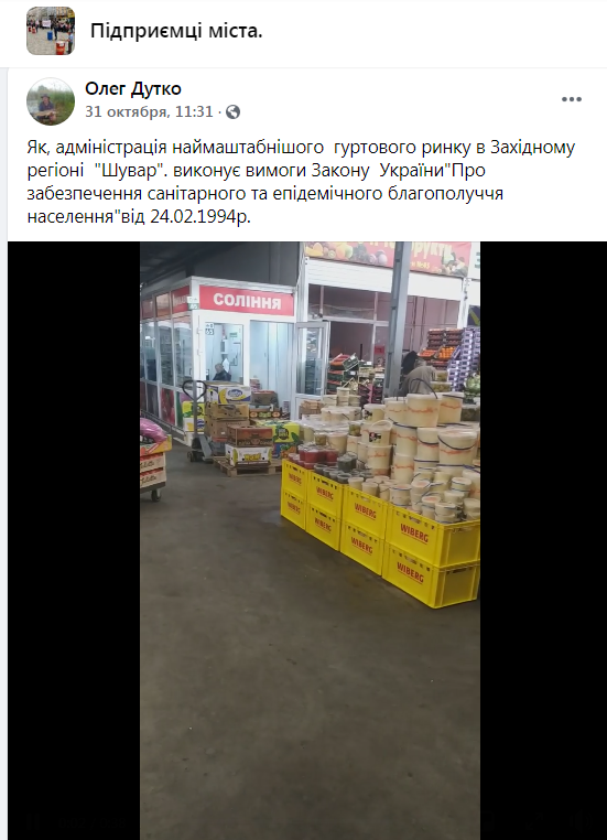 “Як, адміністрація наймаштабнішого гуртового ринку в Західному регіоні “Шувар”. виконує вимоги Закону України”Про забезпечення санітарного та епідемічного благополуччя населення”від 24.02.1994р.”,- зазначає у коментарі до відео на сторінці спільноти “Підприємці міста” у ФБ Олег Дутко.