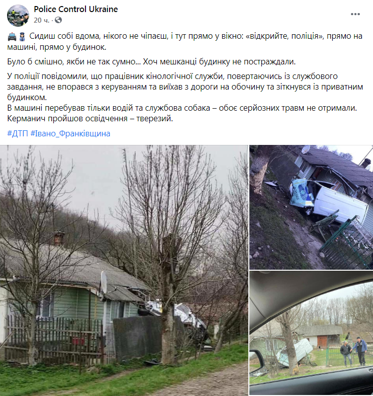 «Сидиш собі вдома, нікого не чіпаєш, і тут прямо у вікно: «відкрийте, поліція», прямо на машині, прямо у будинок. Було б смішно, якби не так сумно… Хоч мешканці будинку не постраждали. У поліції повідомили, що працівник кінологічної служби, повертаючись із службового завдання, не впорався з керуванням та виїхав з дороги на обочину та зіткнувся із приватним будинком. В машині перебував тільки водій та службова собака – обоє серйозних травм не отримали. Керманич пройшов освідчення – тверезий», – зазначається у повідомленні.