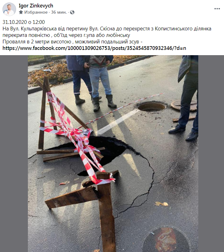 «31.10.2020 о 12:00. На Вул. Кульпарківська від перетину вул. Скісна до перехрестя з Копистинського ділянка перекрита повністю, об’їзд через Героїв УПА або Любінську. Провалля в 2 метри висотою, можливий подальший зсув», – повідомив Зінкевич, який оприлюднив світлини з місця події.