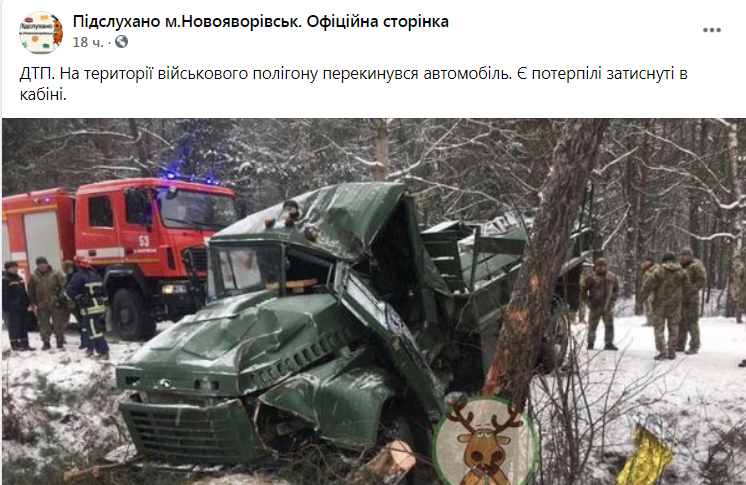 У п’ятьох потерпілих лікарі діагностували переломи та забої. Двох із військових мають оперувати. Напередодні на полігоні перекинувся КРАЗ, який перевозив 29 контрактників. Удар був такої сили, що кабіну автомобіля геть понівечило, а пасажирів з кузова просто порозкидало. За попередньою інформацією, водій був тверезий, а не впорався з кермуванням, бо автомобіль зачепив колесом узбіччя. Дорога була слизька, тож КРАЗ злетів у кювет і увігнався у дерево.