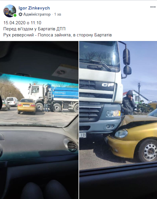 “15 квітня, о 11:10. Перед ві’їздом у Бартатів ДТП. Рух реверсний – полоса зайнята, в сторону Бартатів”, – повідомив Зінкевич.