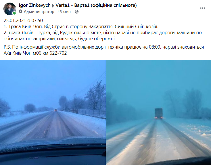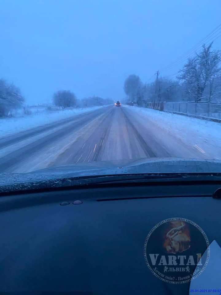 По інформації служби автомобільних доріг області, техніка працює на 08:00, наразі знаходиться а/д Київ Чоп м06 км 622-702», – повідомив у ФБ голова «Варта 1», депутат Львівської міської ради Ігор Зінкевич.