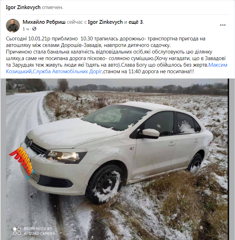 «Хочу нагадати, що в Завадові та Зарудцях теж живуть люди які їздять на авто. Слава Богу що обійшлось без жертв. Станом на 11:40 дорога не посипана!»,- зазначається у повідомленні.