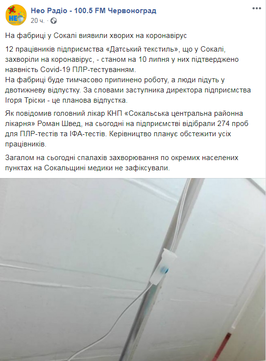 Як пише “Четверта студія” з посиланням на “НЕОРадіо”, 12 працівників підприємства «Датський текстиль», що у Сокалі, захворіли на коронавірус, – станом на 10 липня у них підтверджено наявність Covid-19 ПЛР-тестуванням.