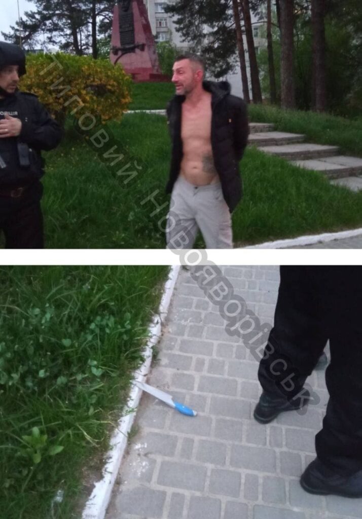 “Сьогодні близько 21:00 біля базару п’яний чи накурений мужчина бігав за людьми і дітьми з двома кухонними ножами. Шукав жовтий бус, хотів зарізати водія (Прізвище та ім’я не будемо вказувати заради безпеки водія).Працівники служби охорони затримували його з пістолетами, потім повезли в райвідділ”, – йдеться у повідомленні.