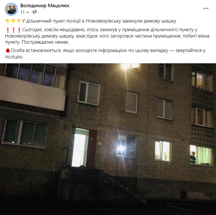 «Хтось закинув у приміщення дільничного пункту у Новояворівську димову шашку, внаслідок чого загорілася частина приміщення, побиті вікна пункту. Постраждалих немає».