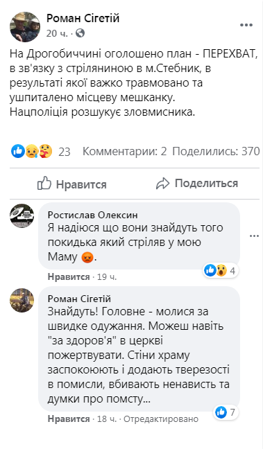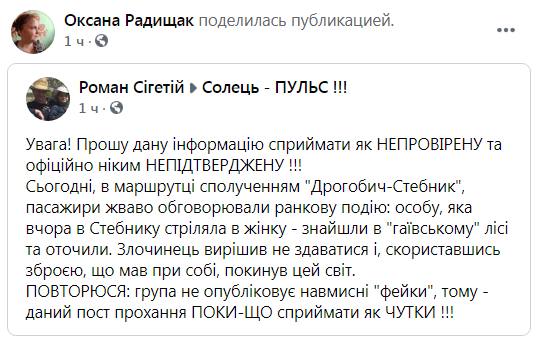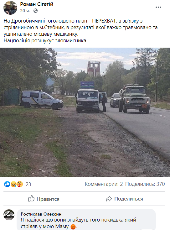 Як повідомив на своїй сторінці у ФБ 25 вересня Роман Сегетій, «сьогодні, в маршрутці сполученням “Дрогобич-Стебник”, пасажири жваво обговорювали ранкову подію: особу, яка вчора в Стебнику стріляла в жінку – знайшли в “гаївському” лісі та оточили. Злочинець вирішив не здаватися і, скориставшись зброєю, що мав при собі, покинув цей світ».