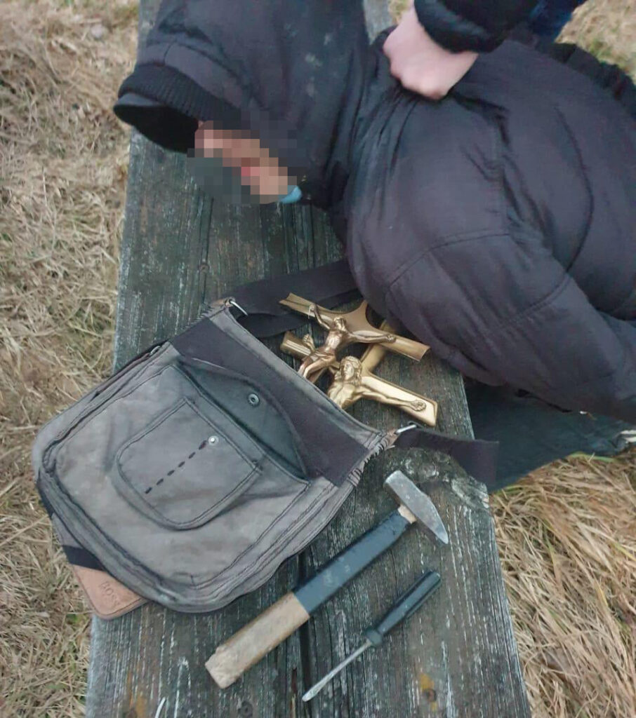 На місці події працювала слідчо-оперативна група територіального підрозділу поліції. правоохоронці встановили особу зловмисника – 33-річного жителя міста Пустомити. Поліцейські виявили у нього 4 розп’яття, інструмент, який він використовував для демонтажу та інші речові докази.