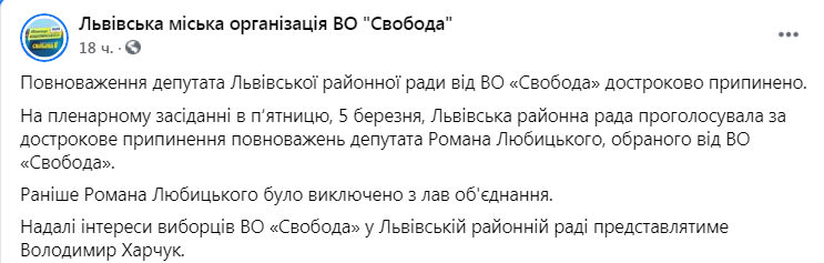 У міському осередку “Свободи” також повідомили, що в районній раді Любицького замінить Володимир Харчук. У часи президентства Петра Порошенка він працював у Львівській ОДА, коли ту очолював Олег Синютка.