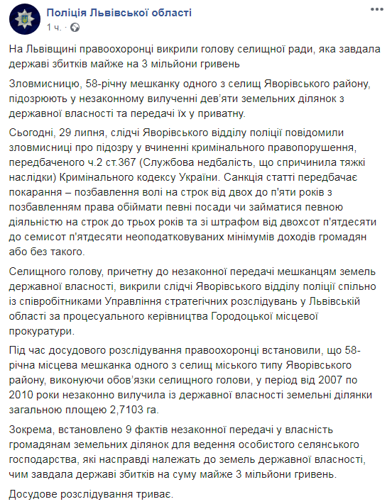 “Під час досудового розслідування правоохоронці встановили, що 58-річна місцева мешканка одного з селищ міського типу Яворівського району, виконуючи обов’язки селищного голови, у період від 2007 по 2010 роки незаконно вилучила із державної власності земельні ділянки загальною площею 2,7103 га”, – зазначається у повідомленні.