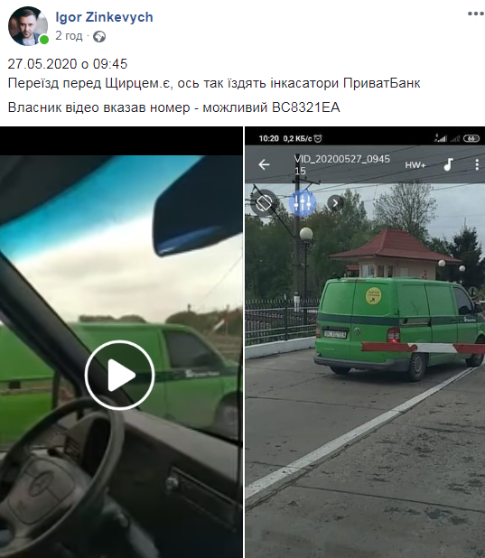 “27.05.2020 о 09:45. Переїзд перед Щирцем. Ось так їздять інкасатори ПриватБанк. Власник відео вказав номер – можливий ВС8321ЕА”, – зазначив у коментарі до відео Ігор Зінкевич.