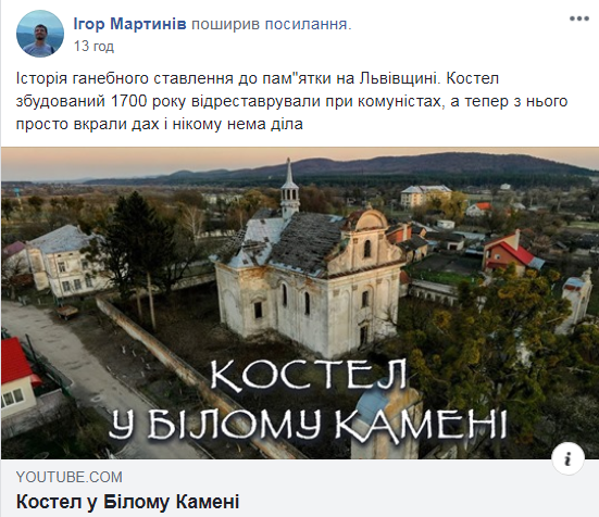 «Історія ганебного ставлення до пам‘ятки на Львівщині. Костел збудований 1700 року відреставрували при комуністах, а тепер з нього просто вкрали дах і нікому нема діла», – зазначається у дописі під відео з місця події.