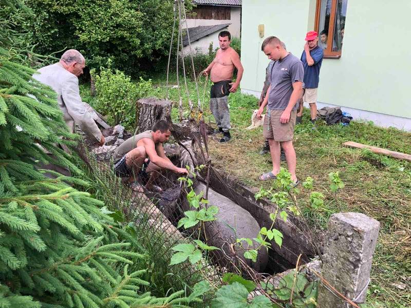 Рятувальники разом із місцевими мешканцями за допомогою пожежних рукавів, рятувальних мотузок та автомобіля з маніпулятором витягнули тварину на поверхню і передали тварину власникові.
