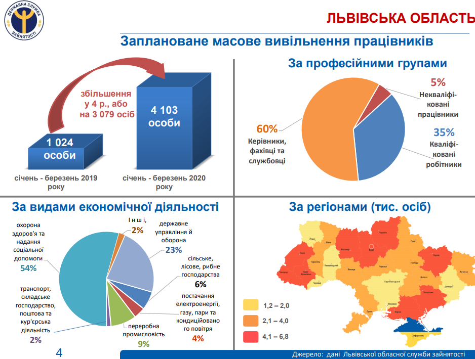 До яких центрів зайнятості Львівщини надійшли звіти про скорочення: Львівський міський центр зайнятості отримав інформацію про заплановане вивільнення 1465 працівників, Золочівська РФ ЛОЦЗ – 897, Турківська РФ ЛОЦЗ – 392, Дрогобицький МРЦЗ – 225, Жовківська РФ ЛОЦЗ – 203 особи.