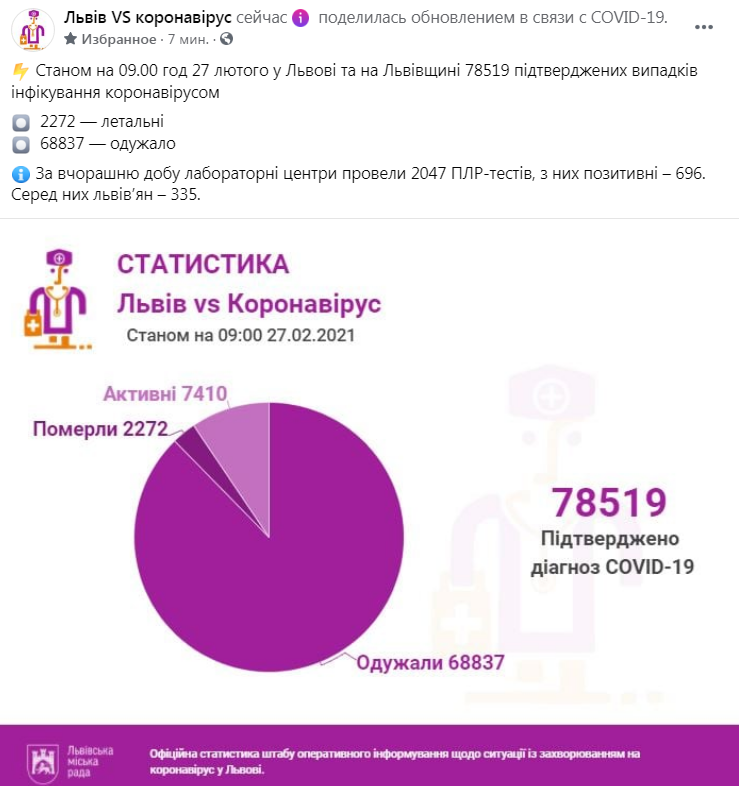 На Львівщині, станом на 09.00 год 27 лютого, 78519 підтверджених випадків інфікування коронавірусом, 2272 — летальні, 68837 — одужало.