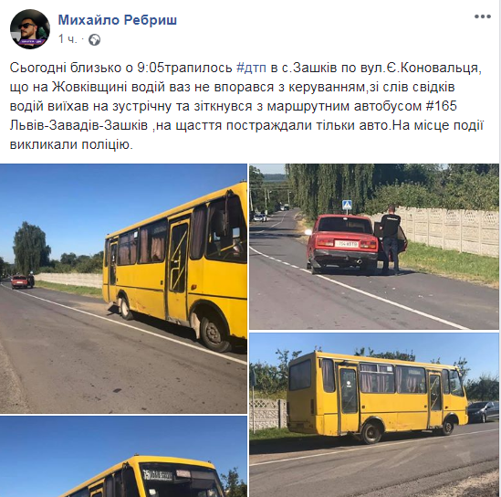 “Сьогодні, близько о 09.05, трапилось ДТП в с.Зашків по вул. Є.Коновальця, що на Жовківщині. Водій автомобіля ВАЗ не впорався з керуванням. Зі слів свідків, водій виїхав на зустрічну та зіткнувся з маршрутним автобусом №165 Львів-Завадів-Зашків. На щастя, постраждало тільки авто. На місце події викликали поліцію”, – повідомив на своїй сторінці у ФБ Михайло Ребриш, який оприлюднив світлини з місця події.