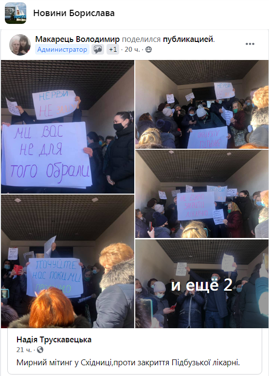 «Мирний мітинг у Східниці проти закриття Підбузької лікарні», – зазначається у коментарі до фото.