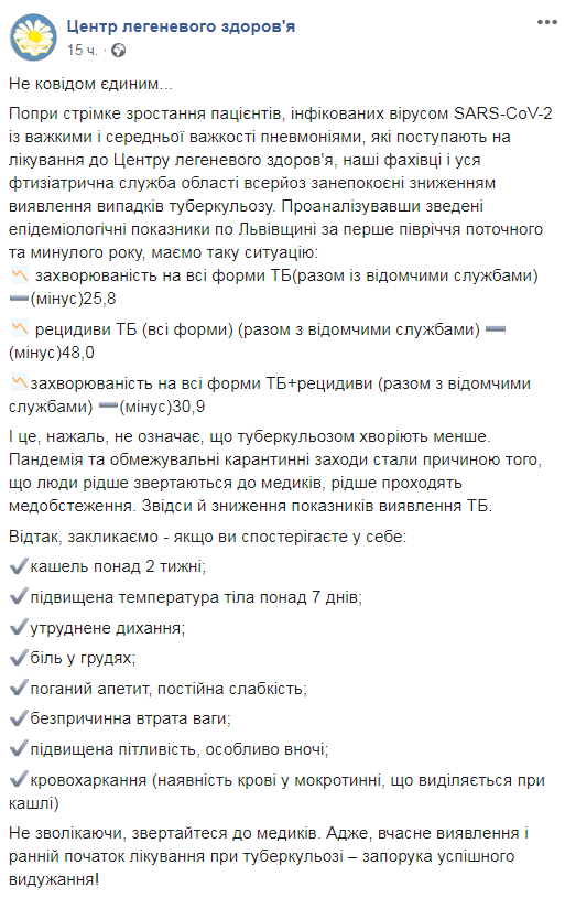 “Не ковідом єдиним. Попри стрімке зростання пацієнтів, інфікованих вірусом SARS-CoV-2 із важкими і середньої важкості пневмоніями, які поступають на лікування до Центру легеневого здоров’я, наші фахівці і уся фтизіатрична служба області всерйоз занепокоєні зниженням виявлення випадків туберкульозу. Проаналізувавши зведені епідеміологічні показники по Львівщині за перше півріччя поточного та минулого року, маємо таку ситуацію: