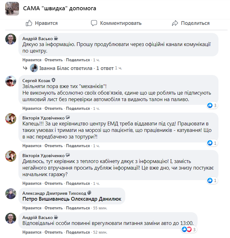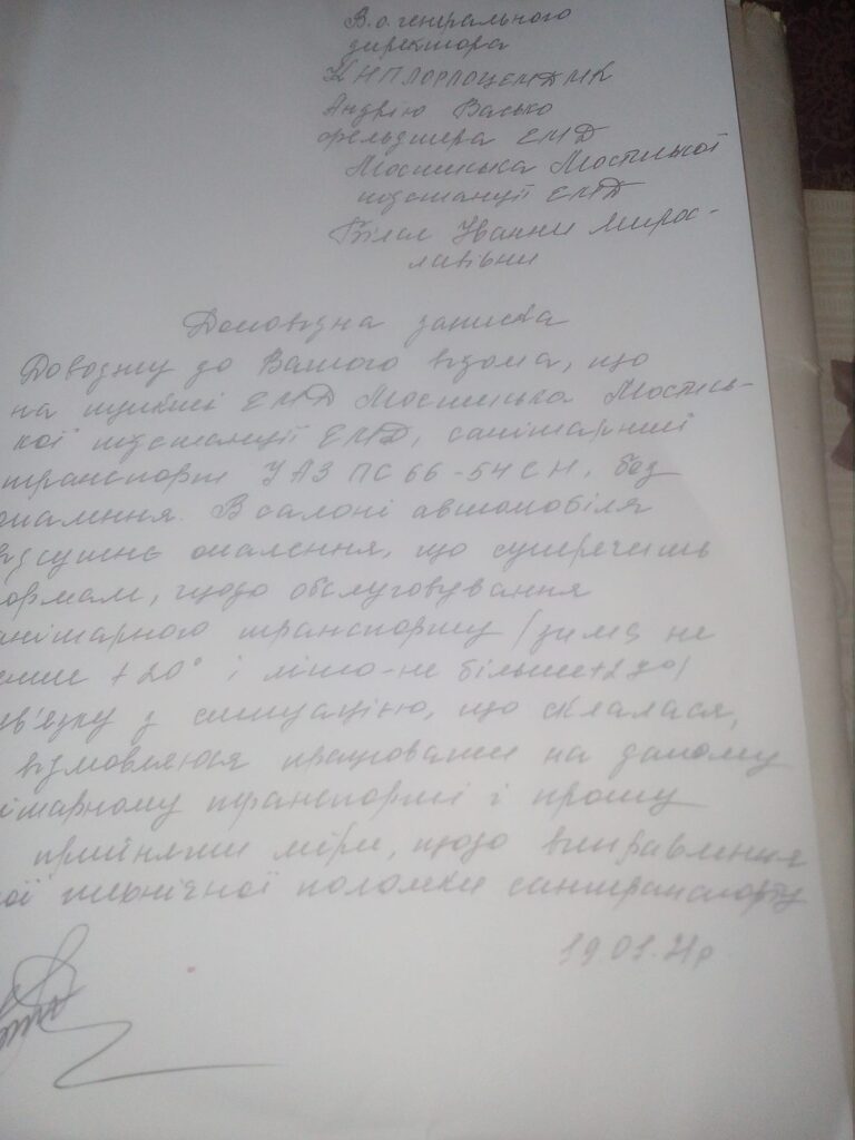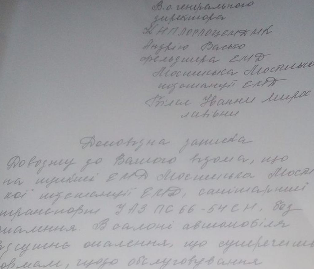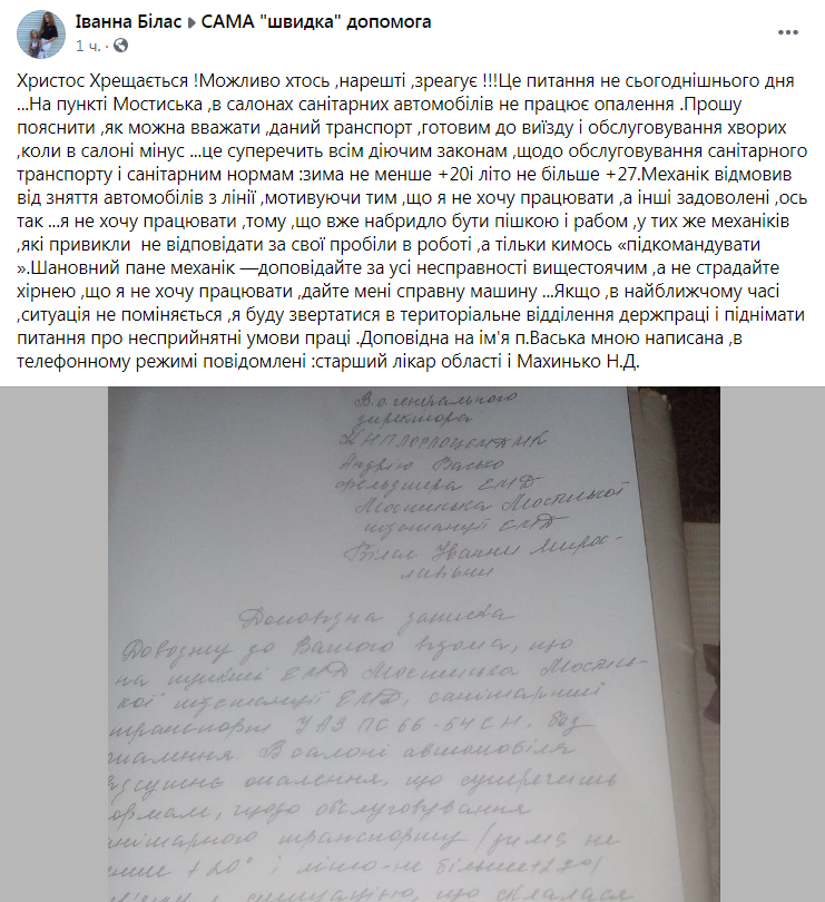 «Можливо хтось, нарешті, зреагує! Це питання не сьогоднішнього дня… На пункті Мостиська, в салонах санітарних автомобілів не працює опалення. Прошу пояснити, як можна вважати даний транспорт готовим до виїзду і обслуговування хворих, коли в салоні мінус… Це суперечить всім діючим законам щодо обслуговування санітарного транспорту і санітарним нормам: зима не менше +20 і літо не більше +27.