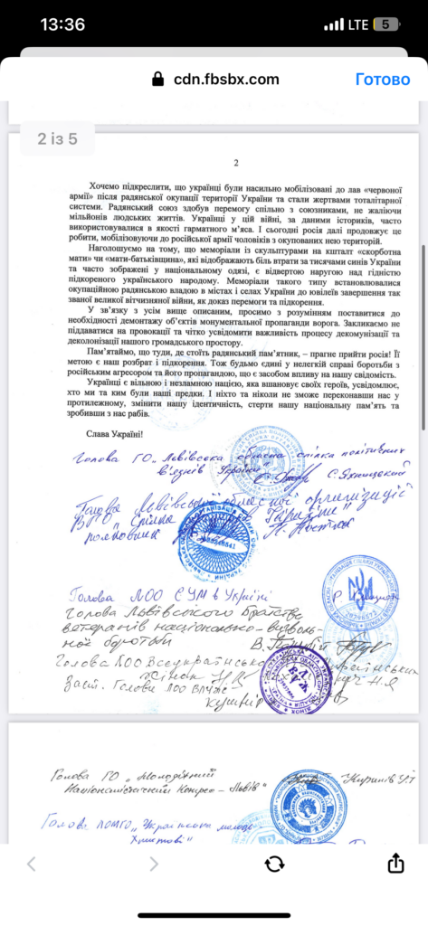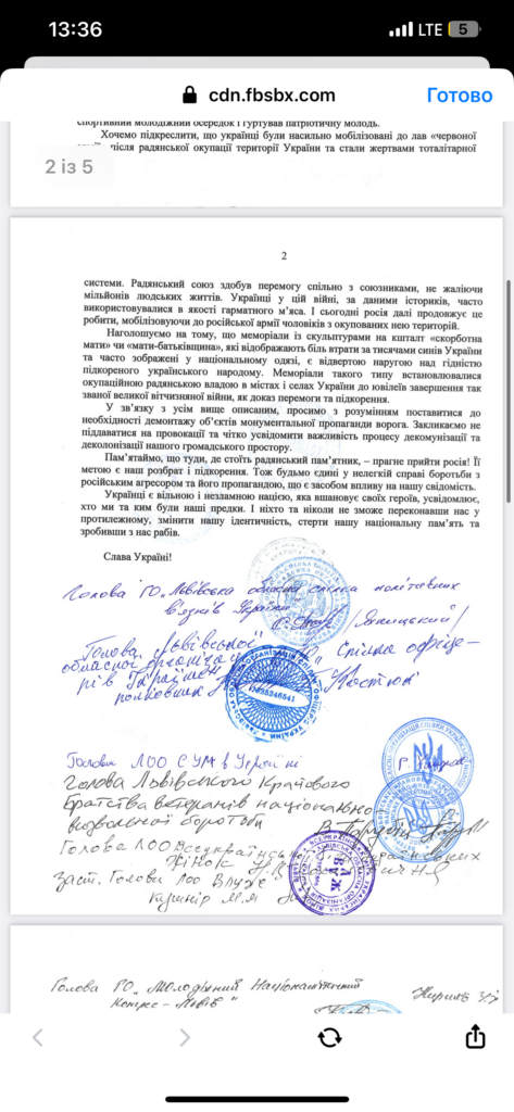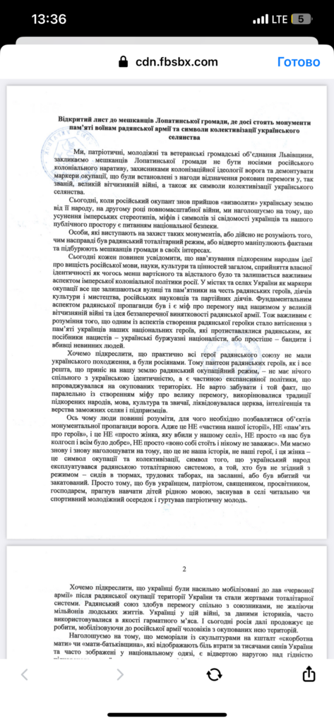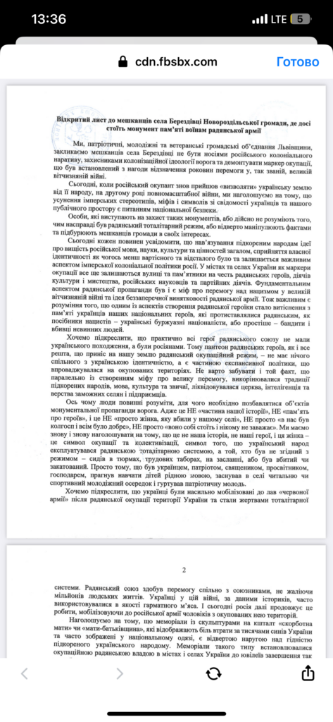 «Ми закликаємо мешканців не бути носіями російського колоніального наративу, захисниками колонізаційної ідеології ворога та демонтувати маркери окупації, що були встановлені з нагоди відзначення роковин перемоги у, так званій, великій вітчизняній війні, а також як символи колективізації українського селянства», — йдеться у листі, у листі який підписали громадські активісти.