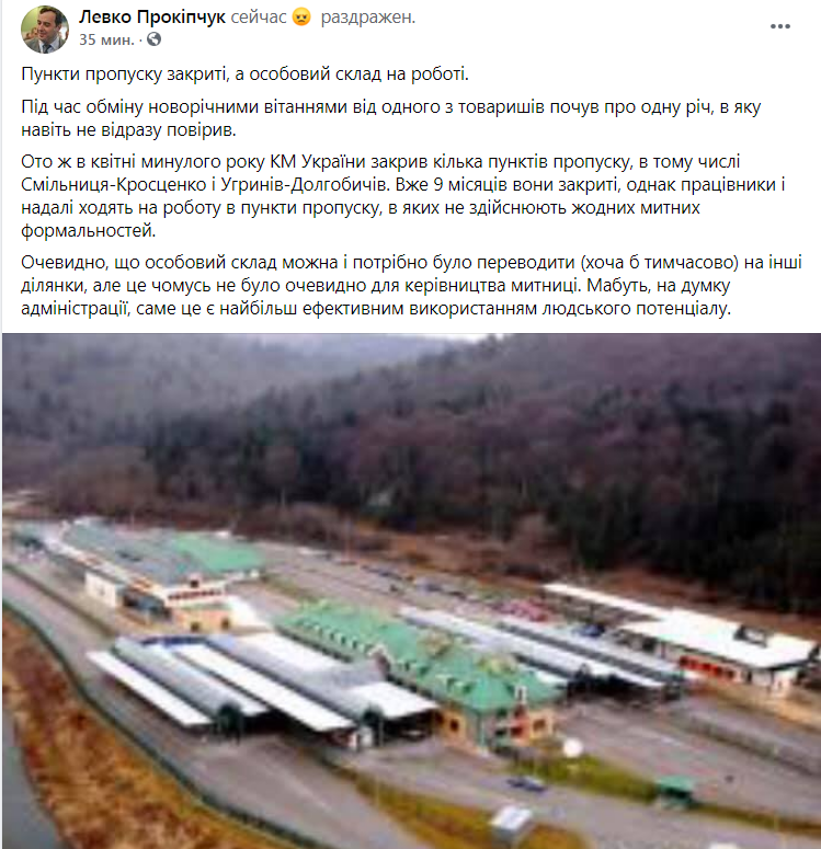 «Пункти пропуску закриті, а особовий склад на роботі. Під час обміну новорічними вітаннями від одного з товаришів почув про одну річ, в яку навіть не відразу повірив. Ото ж в квітні минулого року КМ України закрив кілька пунктів пропуску, в тому числі Смільниця-Кросценко і Угринів-Долгобичів. Вже 9 місяців вони закриті, однак працівники і надалі ходять на роботу в пункти пропуску, в яких не здійснюють жодних митних формальностей.