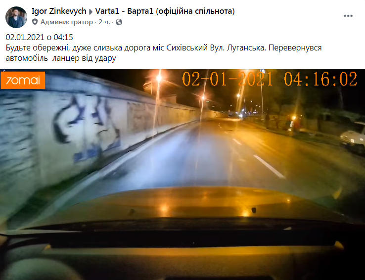 «02.01.2021 о 04:15. Будьте обережні, дуже слизька дорога міст Сихівський, вул. Луганська. Перевернувся автомобіль «Ланцер» від удару», – зазначив у коментарі до оприлюдненого відео координатор «Варта 1» Ігор Зінкевич у ФБ.